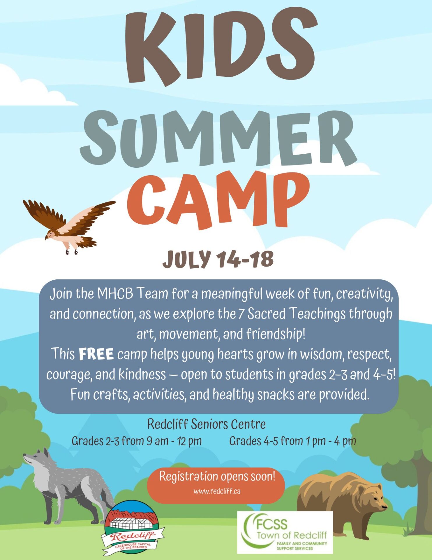 Join the MHCB Team at the Redcliff Seniors Centre July 14-18th for a meaningful week of fun, creativity, and connection, as we explore the 7 Sacred Teachings through art, movement, and friendship!
