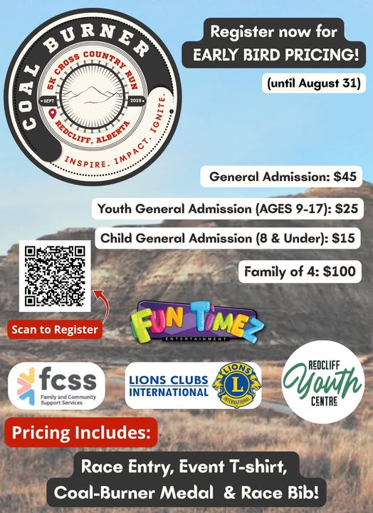 Whether you are a passionate runner, jogger, or casual walker, The Coal Burner 5K Cross Country Race is all about helping support the Redcliff Youth Centre’s youth wellness & life skill programming for youth in our community!