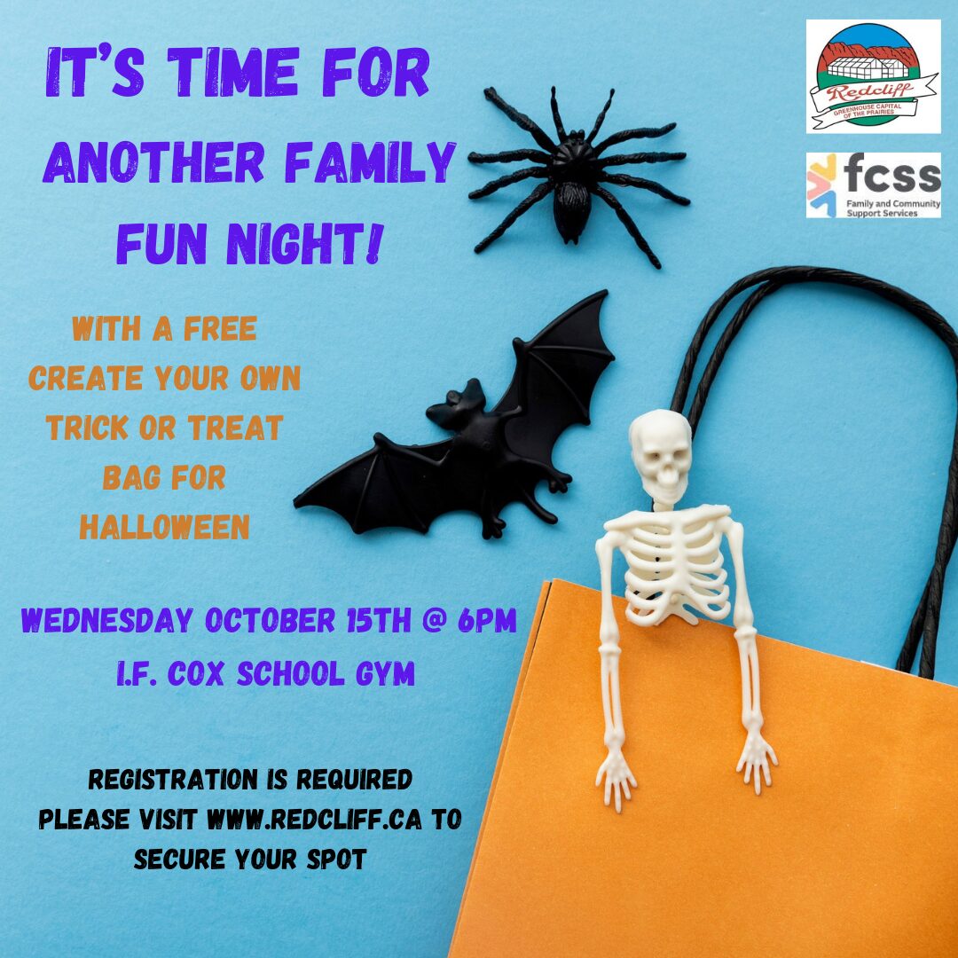 Join the Redcliff FCSS for a FREE create your own trick or treat bag for Halloween, Wednesday, October 15th at 6:00pm at I.F. Cox school gym!