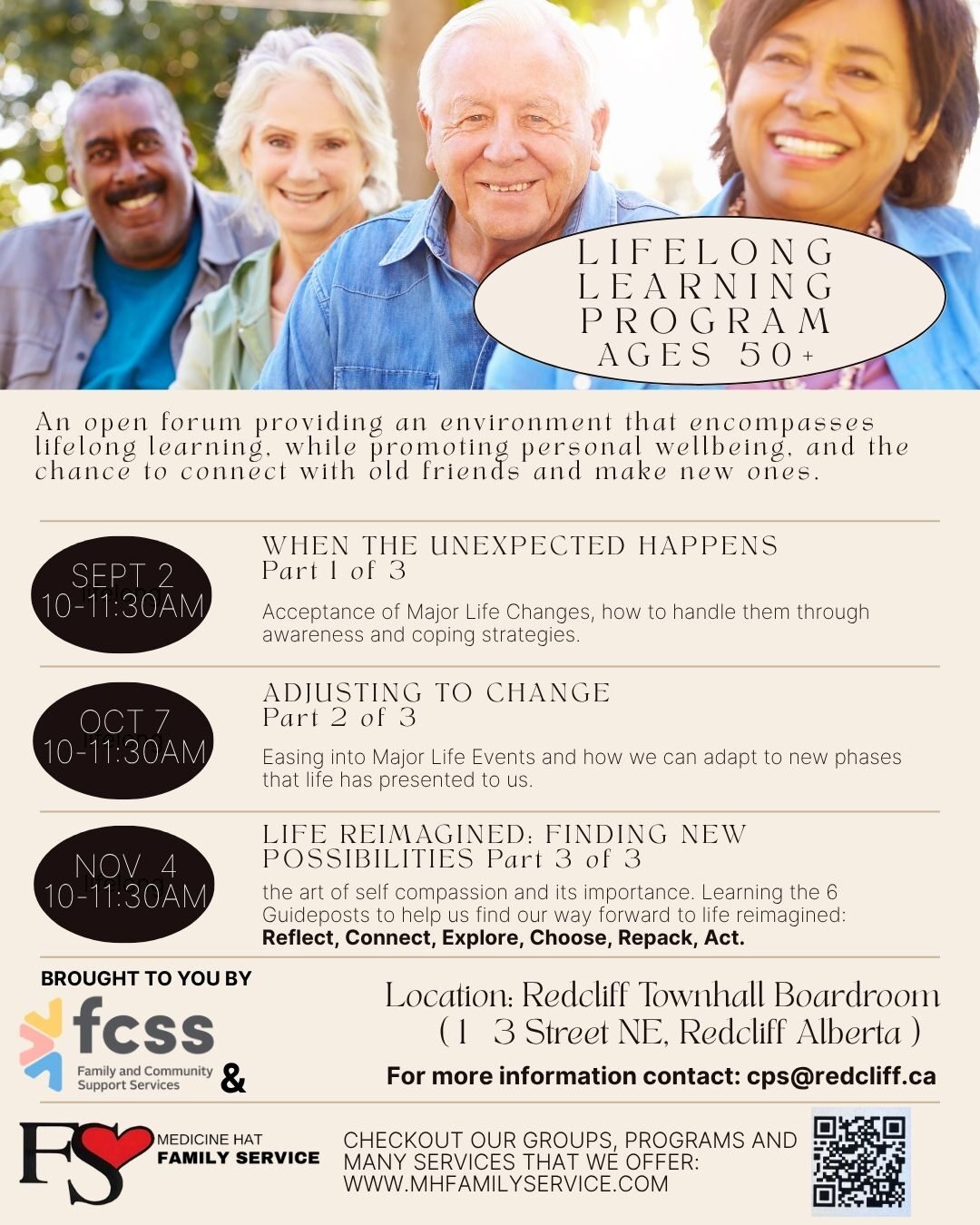 The Redcliff FCSS and Medicine Hat Family Service are proud to announce the return of Lifelong Learning Series at the Redcliff Town Hall Education Room!