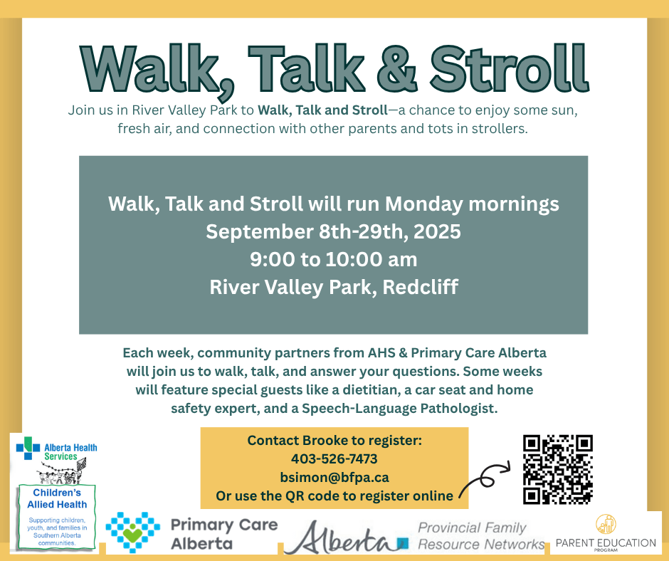 Each week, community partners from AHS and Primary Care Alberta will join us to walk, talk, and answer your questions. Special guests will be featured such as a dietician, car seat and home safety expert, and a Speech-Language Pathologist.