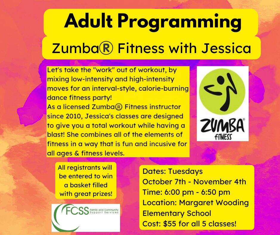 Join Jessica beginning Tuesday, October 7th for Zumba fitness classes at Margaret Wooding Elementary School.
