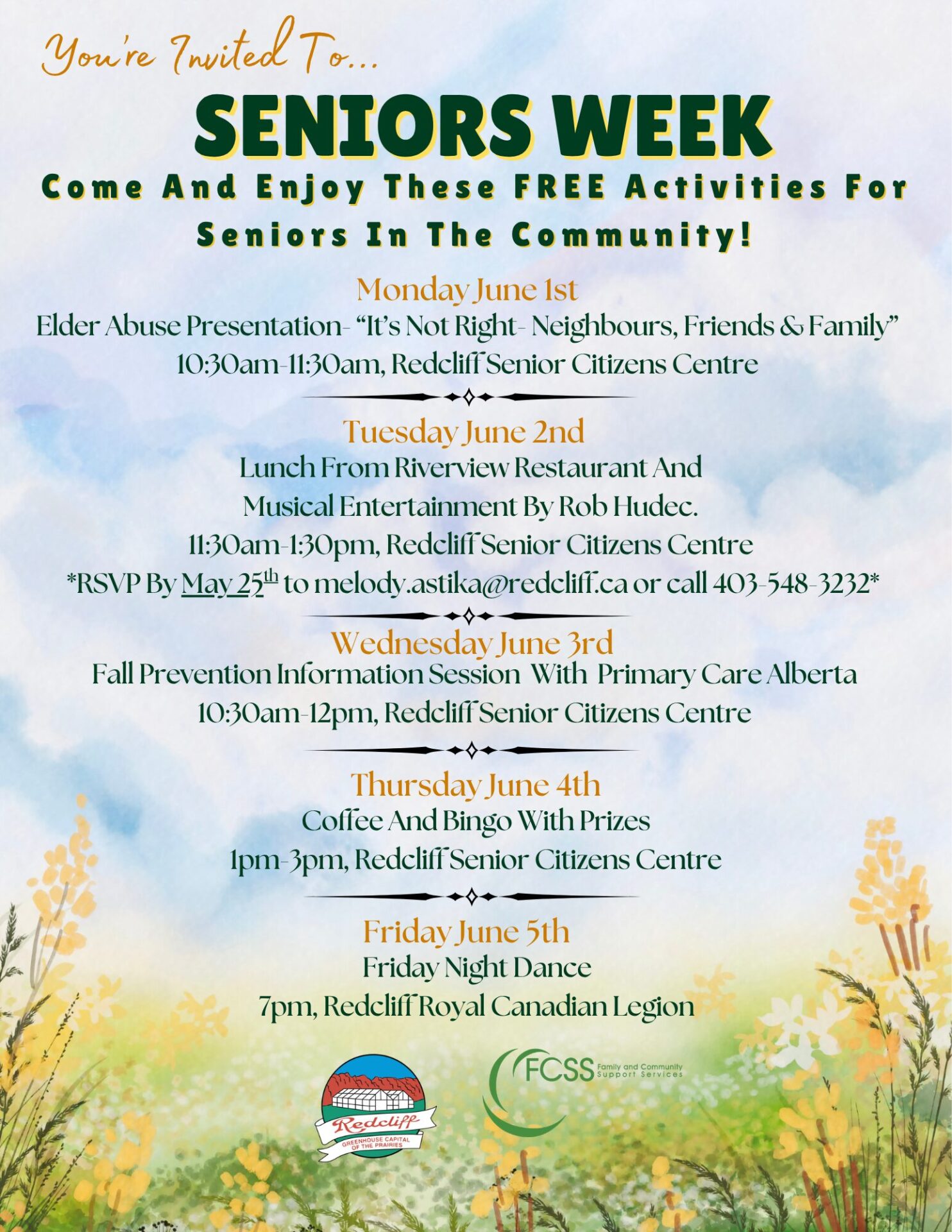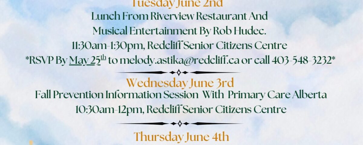 The Redcliff FCSS and Town of Redcliff are proud to announce our Seniors Week FREE community activities, from June 1st – 5th!